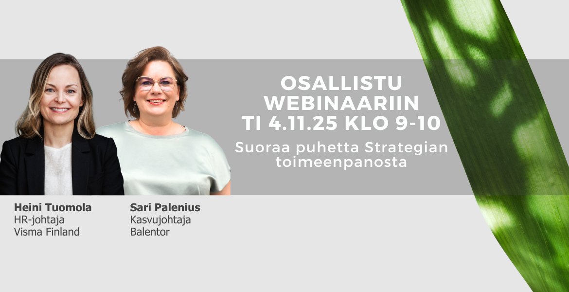 Webinaarissa tullaan kuulemaan rehellistä keskustelua strategiasta: mikä toimii ja mikä ei. Keskusteluun syventyvät kasvujohtajamme Sari Palenius ja Visman HR-johtaja Heini Tuomola, jotka jakavat näkemyksiään strategiatyön käytännöistä, onnistumisista ja karikoista. Luvassa inspiroiva ja ajatuksia herättävä keskustelu huippuosaajien kanssa.