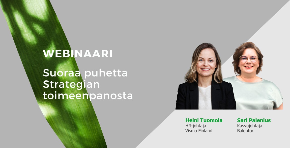 Webinaarissa kuulemme rehellistä puhetta strategian toimeenpanosta: mikä toimii ja mikä ei. Keskusteluun syventyvät kasvujohtajamme Sari Palenius ja Visman HR-johtaja Heini Tuomola, jotka jakavat näkemyksiään strategiatyön käytännöistä, onnistumisista ja karikoista. Luvassa inspiroiva ja ajatuksia herättävä keskustelu huippuosaajien kanssa.